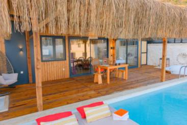Villanın terasında yer alan korunaklı yüzme havuzu ve jakuzi, eşsiz bir manzara eşliğinde dinlenmeniz için ideal. Günün her saati size eşlik eden bu büyüleyici deniz manzarası, tatilinizi unutulmaz kılacak.