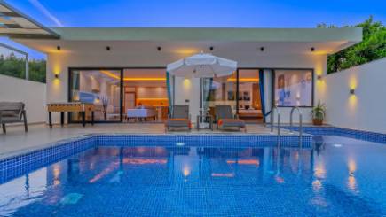 Keyifli salonu ve tam donanımlı mutfağıyla kaliteli yaşam alanları sunan Villa Alkinoos, korunaklı havuz alanı sayesinde de tamamen size özel bir tatil deneyimi sunuyor. Konforlu şezlongları, keyifli oturma alanları bulunan bahçe alanında ayrıca eğlenceli vakitler geçirmeniz için langırt, masa tenisi ve trambolin bulunuyor.