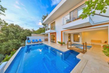 Korunaklı havuz alanı sayesinde, istenmeyen bakışlardan uzak yüzmenin ve güneşlenmenin tadını çıkarabileceğiniz Villa Eleni, aynı zamanda yemyeşil doğa ve uzaktan deniz manzarasını bir araya getiren yüksek konumuyla seyir zevki yüksek bir tatil de sunuyor. Havuz terasında konforlu şezlonglar, keyifli bir oturma grubu ve açık hava yemekleri için masa-sandalye takımıyla tatilin her anında kullanışlı alanlar sunan Villa Eleni, dinlenmek ve manzaranın tadını çıkarmak için ideal bir atmosfer sağlıyor.