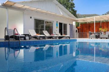Villanın havuz terasına adım attığınız anda çok özel bir doğa manzarası tarafından karşılanacaksınız. Yeşilin her tonuna şahit olabileceğiniz ve temiz havayı doyasıya soluyacağınız bu bölüm ve villanın yüzme havuzu korunaklı tasarıma sahip. Dışarıdan görünmemesi sayesinde, muhafazakar misafirler de huzurla vakit geçirebiliyor.