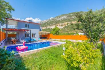 Geniş bir yüzme havuzu olan villada, havuz keyfi yaparken istenmeyen bakışlar konusunda endişe etmenize gerek kalmıyor. Dışarıdan görünmeyen havuz bölümü, muhafazakar tatilciler için de uygun bir tasarıma sahip.