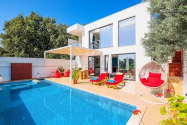 Villa Rint’in havuz bölümü, muhafazakar hassasiyetlere sahip misafirlere uygun yapıda. Dışarıdan görünmeyen havuz bölümünde, mahremiyetinizi koruyarak güneşlenebilir, deniz manzarasını izleyerek havuzun tadını çıkarabilirsiniz.