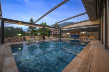 Ev konforunu aratmayan bu muhteşem villanın geniş yüzme havuzu da muhafazakar misafirlere uygun. Muhteşem bir manzarayı izleyerek keyifle vakit geçirebileceğiniz korunaklı yüzme havuzunda mahremiyetiniz her an garanti altında olacak.